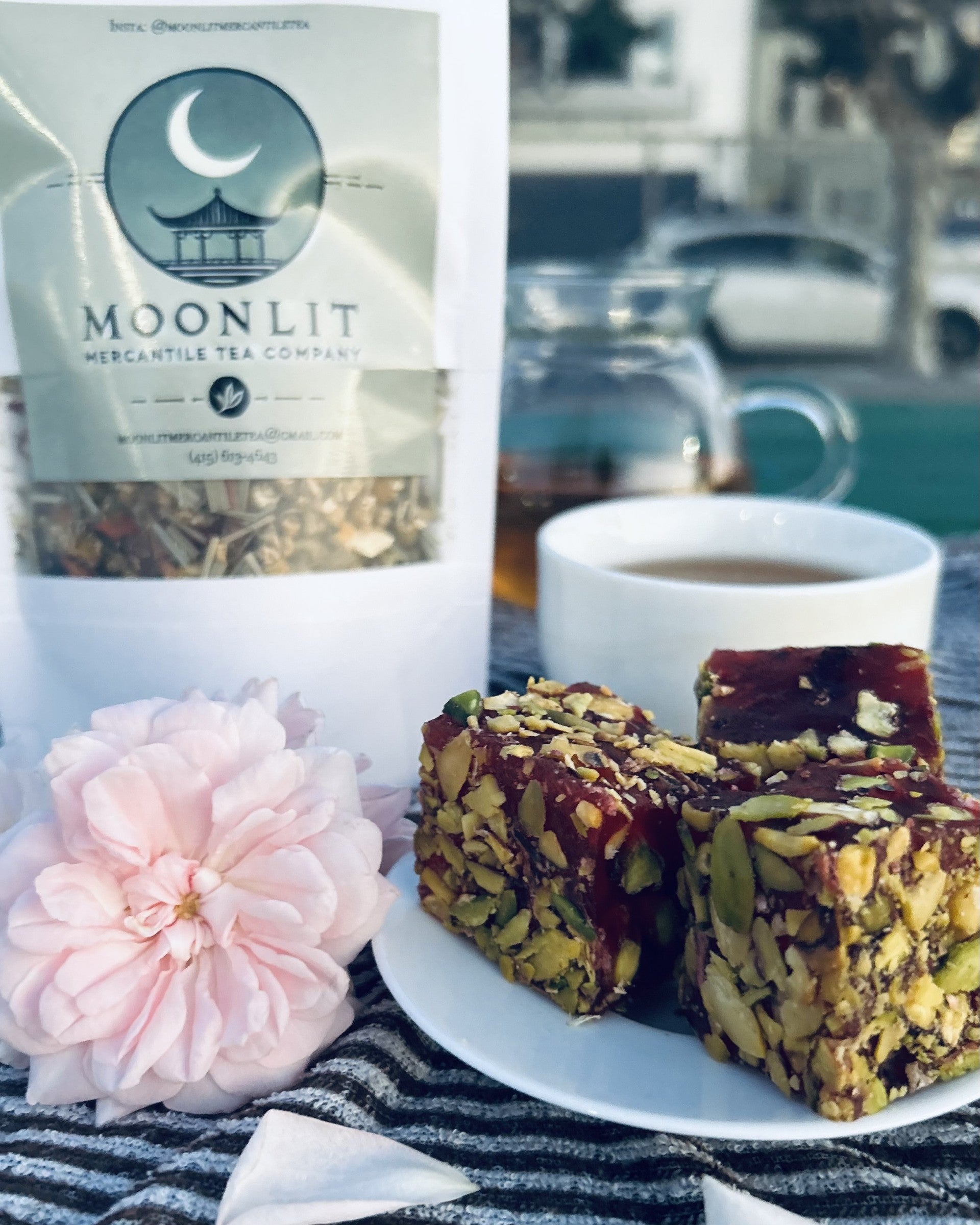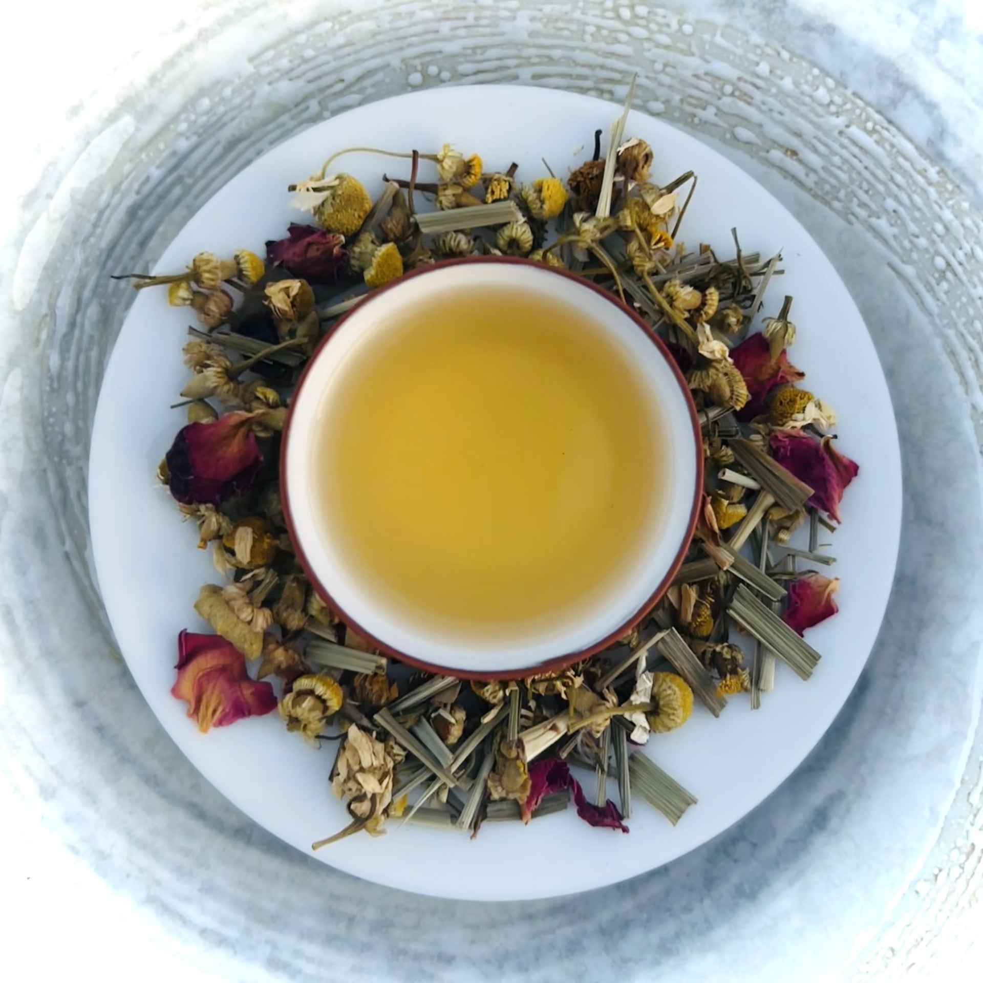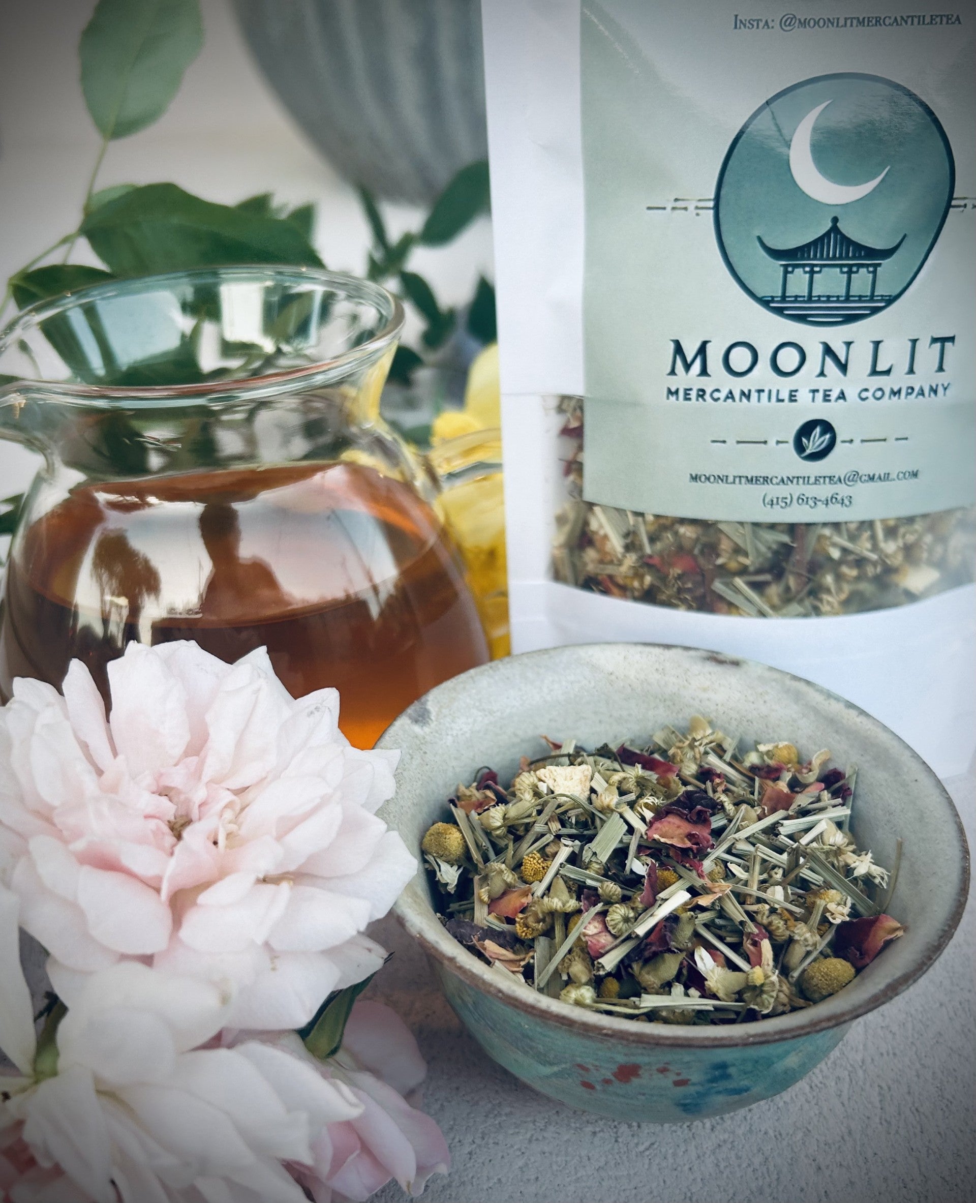 Moonlit's first herbal blend, highlighting two soothing East & West botanicals - Vietnamese lemongrass, & German chamomile.