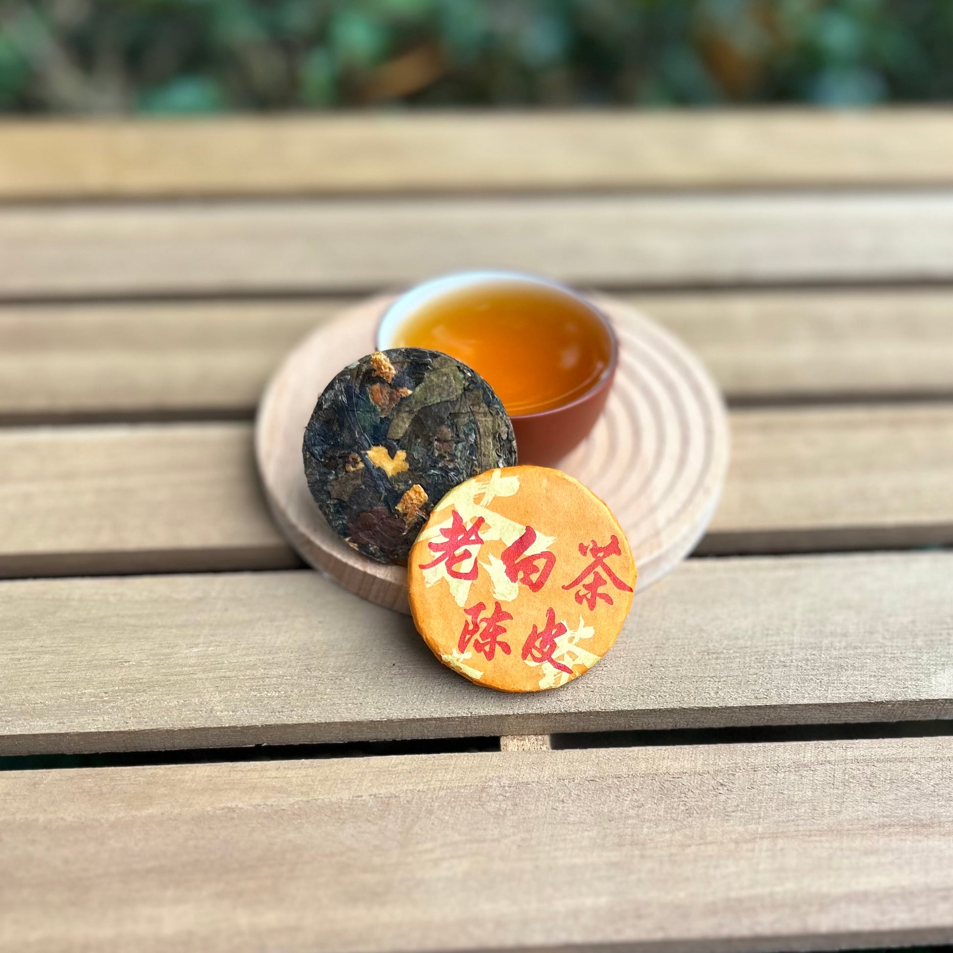 Aged Fujian white tea & aged tangerine - slowly matured to a delicate citrus perfection. Great for the patient thinker or those who love the medicinal boons of aged tea & mandarin peel.