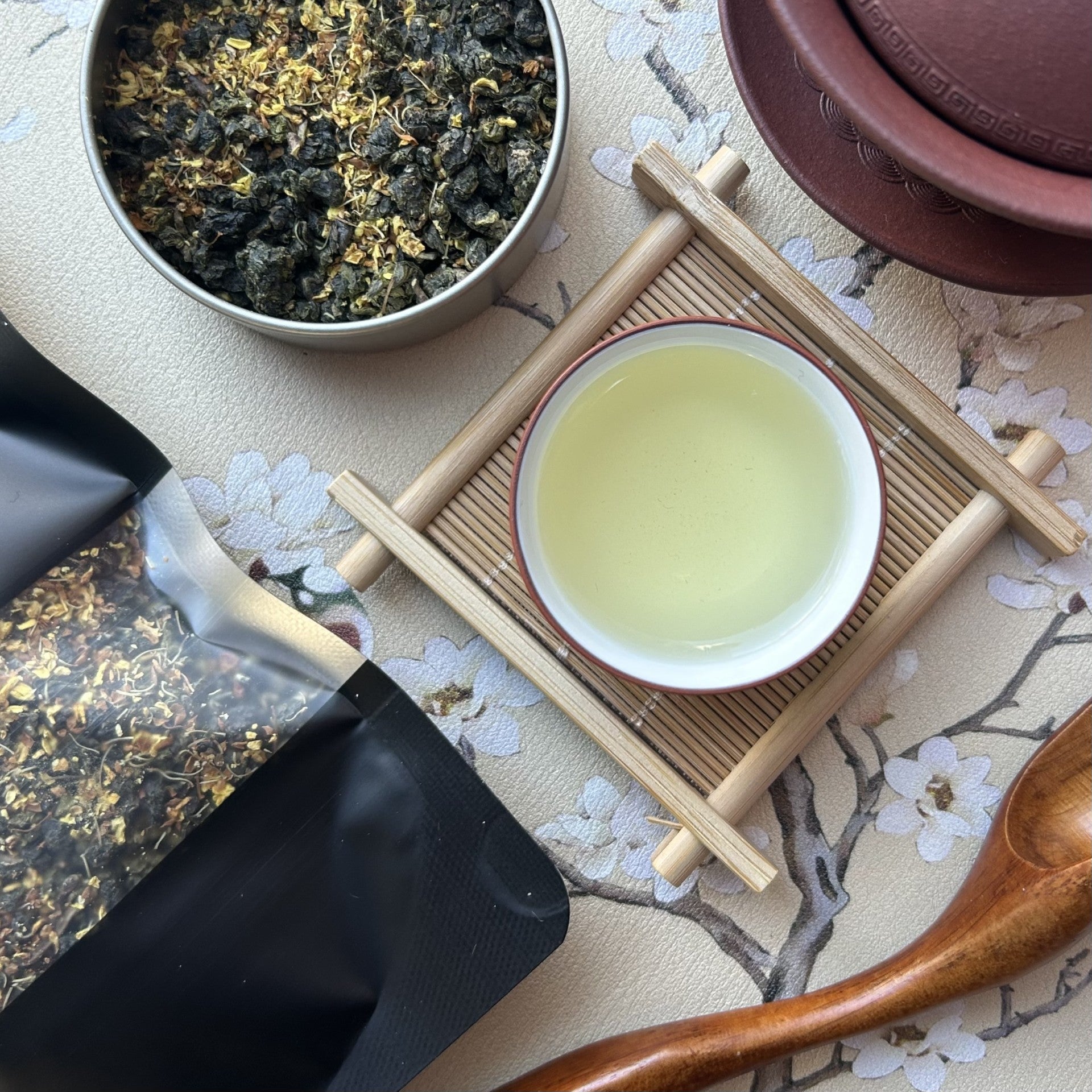 Taiwan's tropical take on the classic Chinese jasmine green. Expertly light roasted oolong leaves meet the natural, musky sweet scents of whole-blossom island osmanthus, producing a celadon green cup with heavy floral overtones juxtaposed by a subtle watermelon sweetness.
